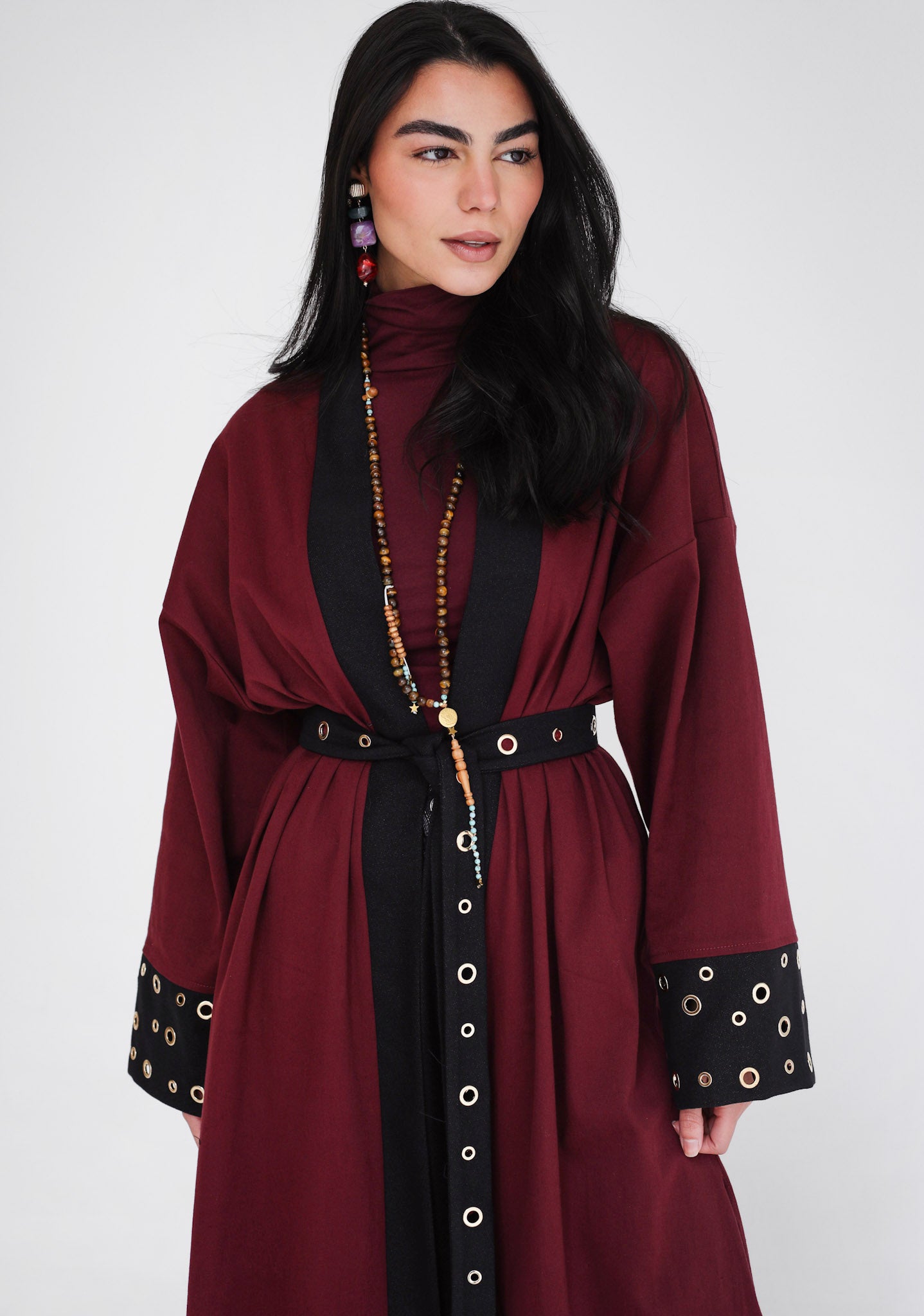 Redefine modest luxury with the Eyelet Caftan, a masterpiece of contemporary tailoring and bold hardware. Designed for the woman and girls who command attention, this floor-length duster blends a traditional silhouette with a gritty, industrial edge.