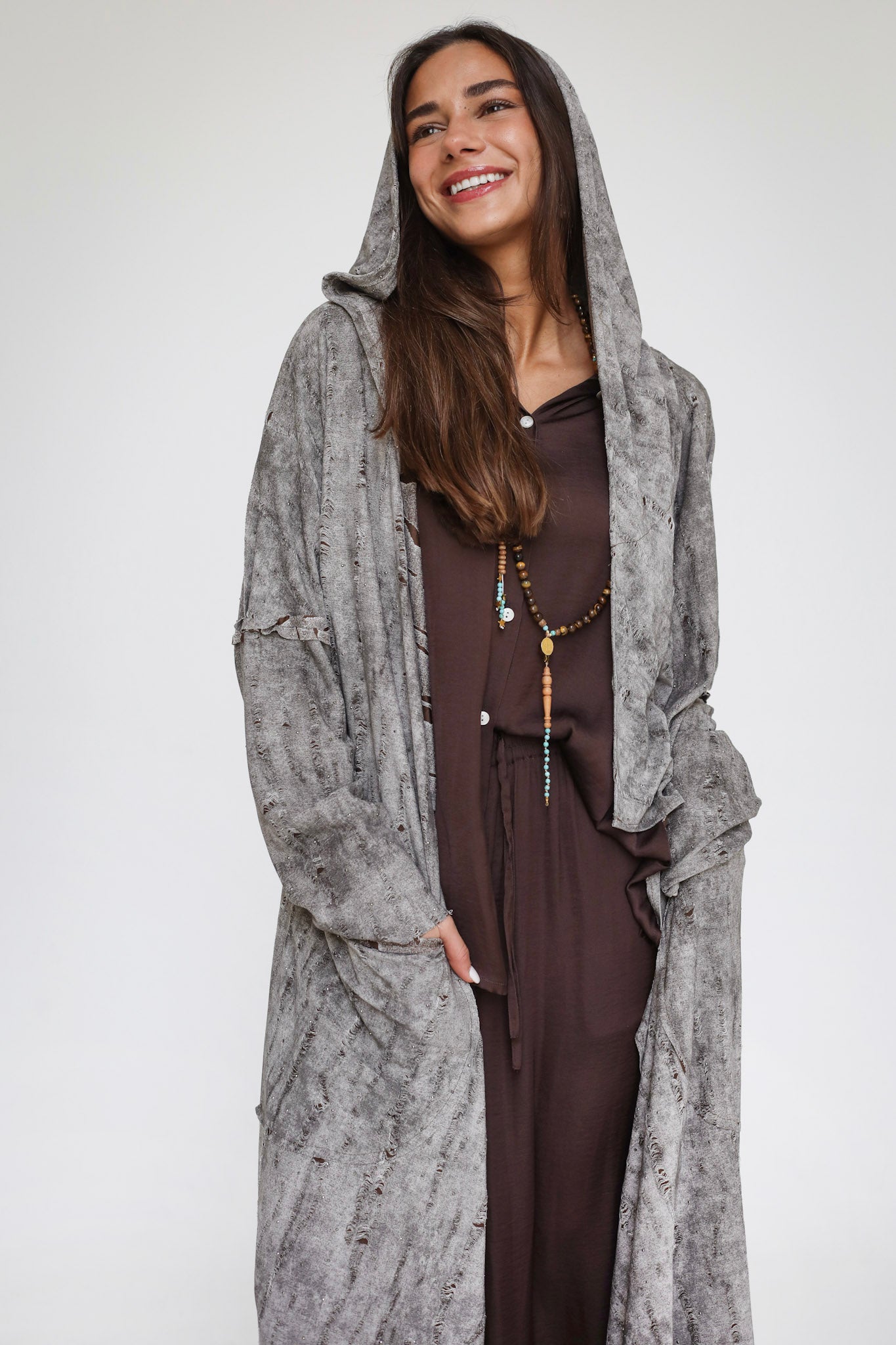 Architectural Silhouette: The oversized, draped collar and dramatic length create a powerful silhouette, while the hooded back adds a layer of mysterious, urban functionalism.
