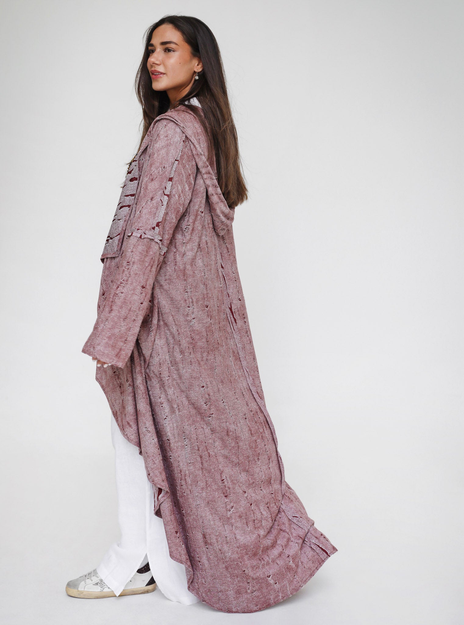 Elevate your layering game with this striking, floor-length duster that blends rugged texture with unexpected shimmer. Crafted with a heavy emphasis on deconstructed design, this piece features intentional inside-out seam detailing and raw, frayed edging that gives it a bold, editorial edge.