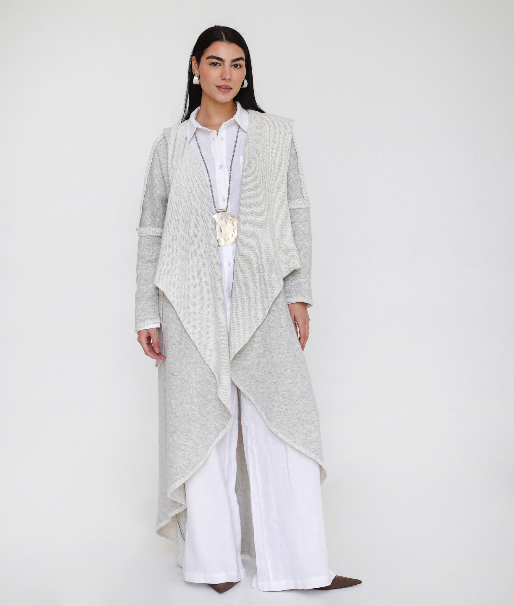 Exquisitely crafted from the finest high-quality wool, this hooded cardigan offers a soft, substantial feel that provides warmth without compromising on fluid movement. Its monochromatic grey palette is elevated by a sophisticated inside-out construction, turning the structural elements of the garment into its most striking design features.