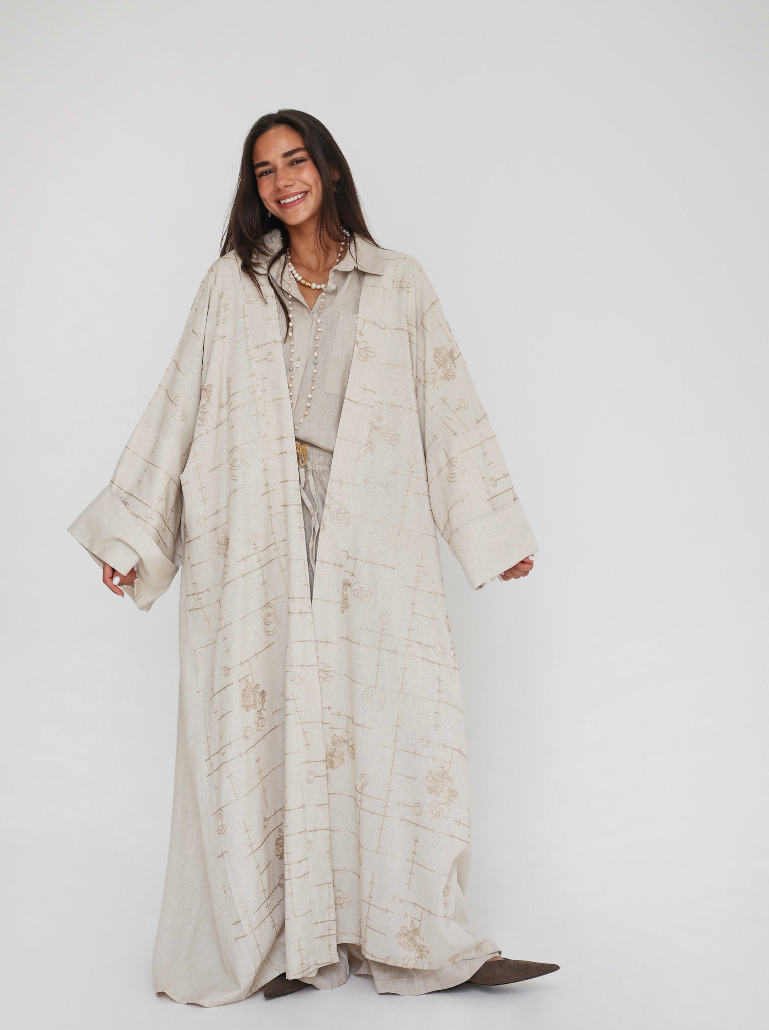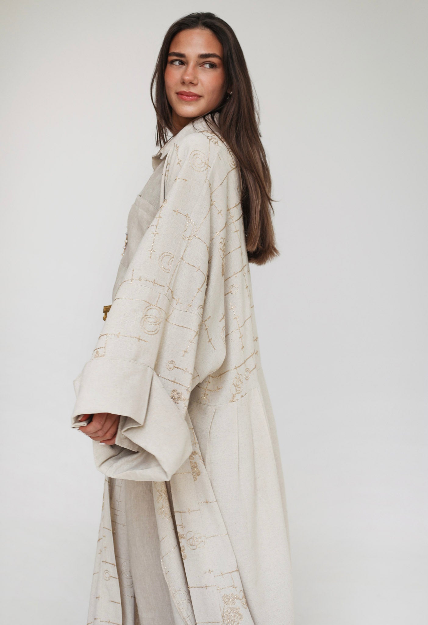 This heavyweight linen caftan is a masterclass in architectural tailoring and understated luxury. Designed for the modern woman who appreciates artisanal detail, it offers a structured silhouette that maintains its shape while providing the natural, breathable comfort of high-quality linen.