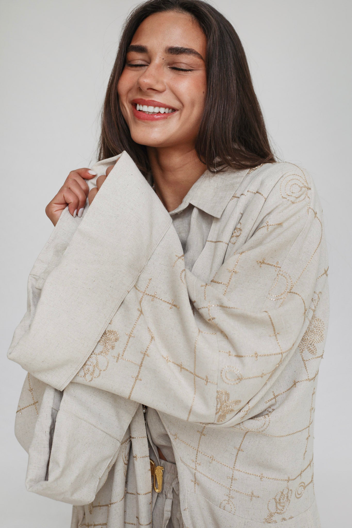 Artisanal Finish: The neutral, oatmeal-toned linen serves as a raw, organic canvas for the gilded embroidery, striking a perfect balance between rustic texture and regal elegance.